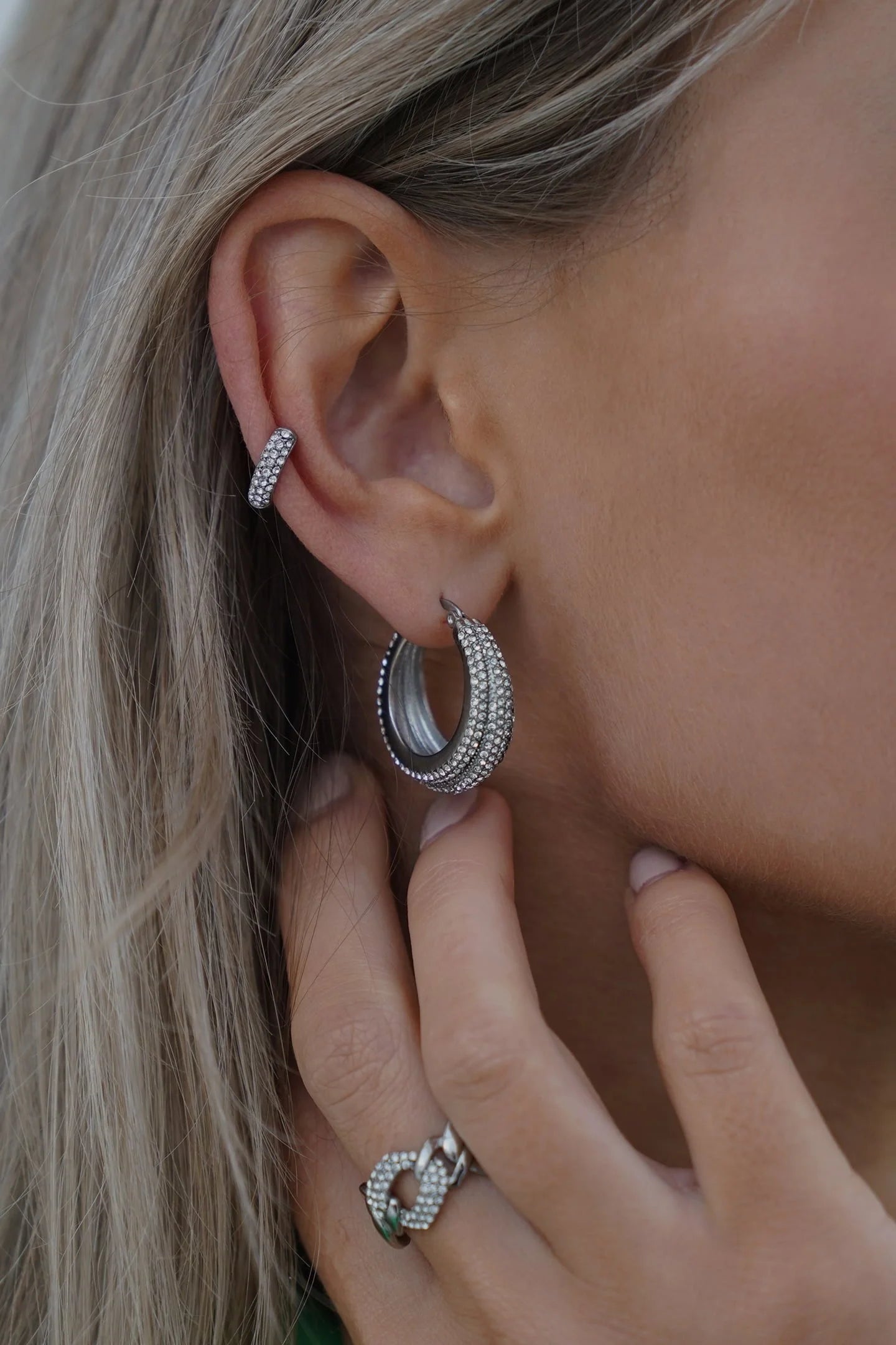 Get that sparkle with our Pavé Hoops in Silver. A relatively small hoop covered with shimmering strass stones. A tiny but extraordinary piece of jewelry. Discover more of our strass jewelry and combine accordingly.