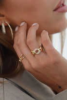 The Pave Chain Ring is a truly bold statement ring. The ring is partially finished with strass stones that add a beautiful dimension of sparkle and texture to the look of the ring. The Pave Chain Ring is a great addition to your look for a pop of bling.
