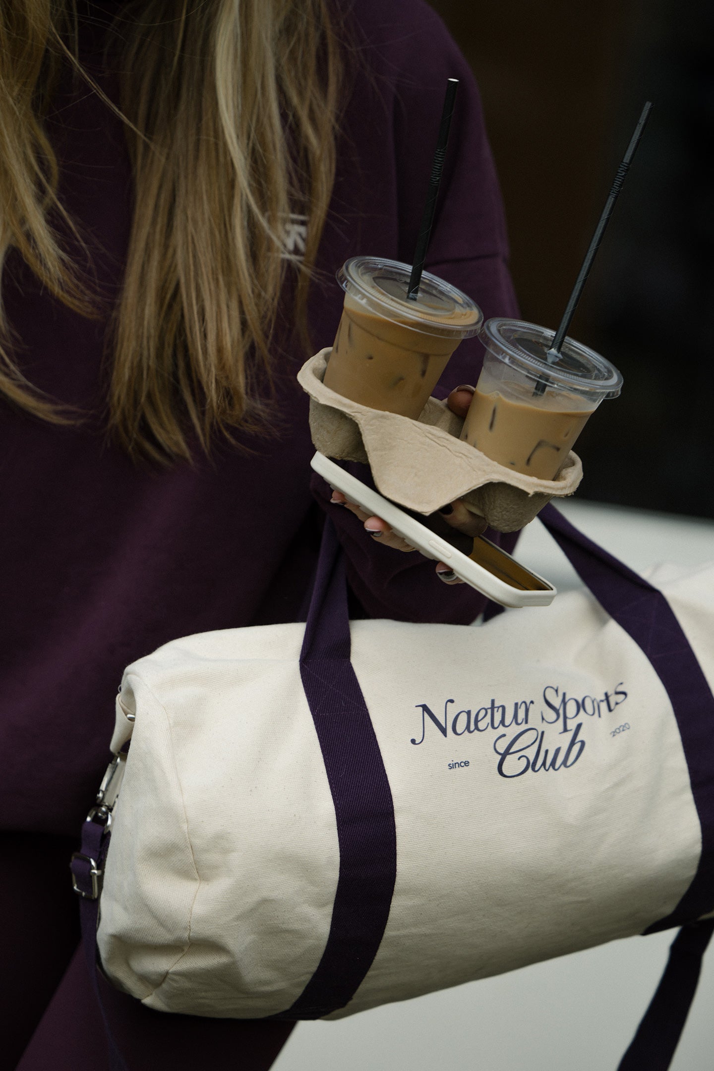 The Sport Duffel Bag is made from sturdy cream canvas that holds its shape while staying lightweight enough for everyday use. Plum-colored straps add contrast and character, finished with a matching plum logo for a subtle but recognizable look.