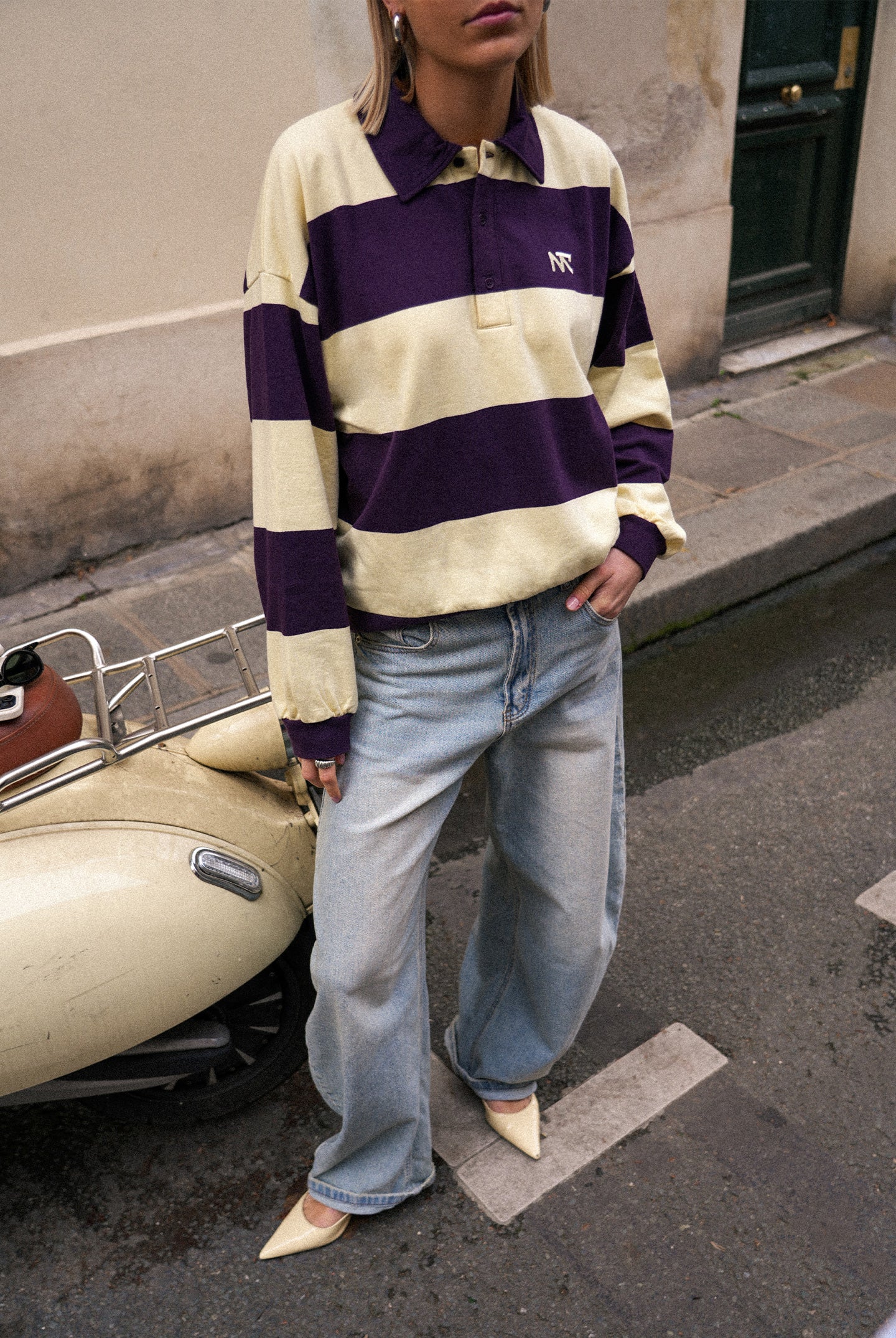 The Striped Polo | Olive offers a modern take on the classic rugby top. Crafted from 100% cotton for a soft, breathable feel and designed with a relaxed boxy fit. The mix of olive green and butter yellow stripes creates a calm yet distinctive look. Easy to wear on its own or layered.