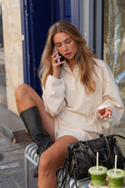 This 100% cotton sweater polo in a Oat Milk hue combines comfort with modern versatility. Adjustable drawstrings at the hem and sleeves let you tailor the fit to your style, relaxed or cinched. The snap-button collar adds a refined touch and allows for multiple styling options. Perfect for layering or wearing on its own, this piece transitions effortlessly from casual to smart.